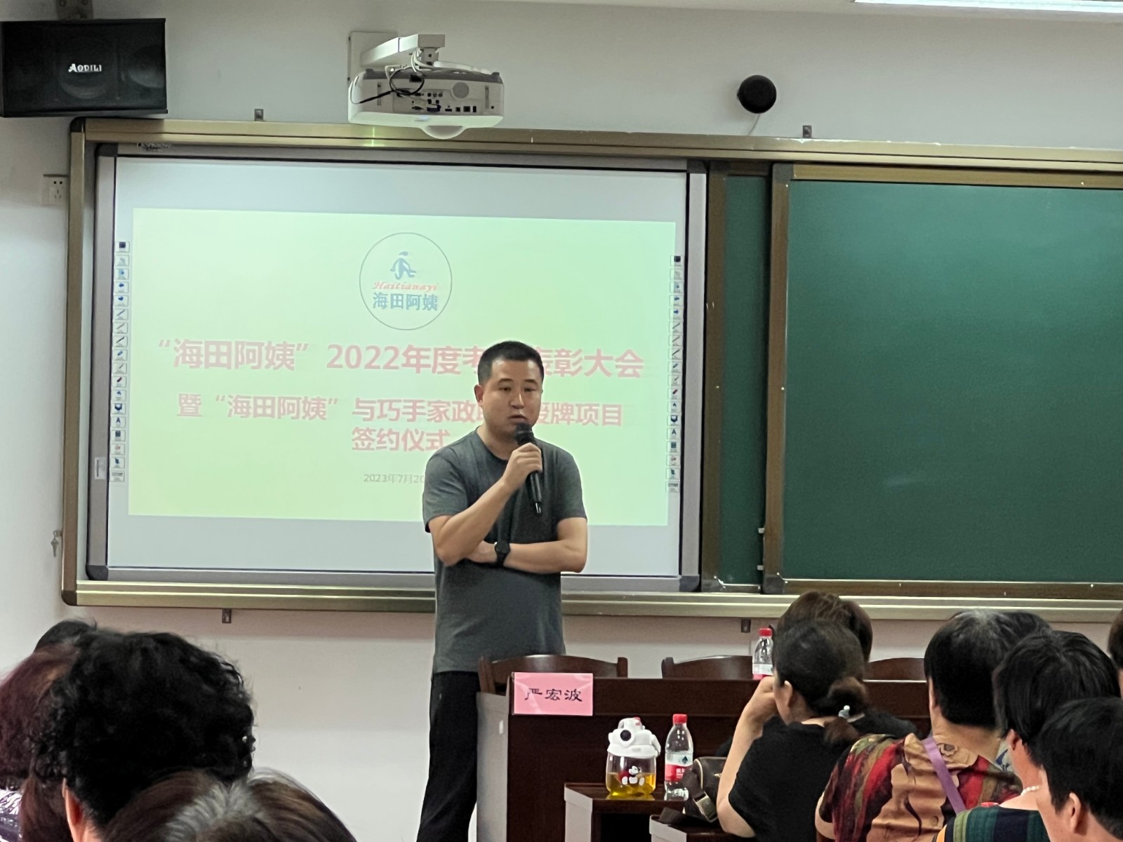2023年7月20日,“海田阿姨”2022年度考评表彰大会暨“海田阿姨”与巧手家政联合授牌项目签约仪式在澥浦成校举行,澥浦镇副镇长严宏波、社会组织服务中心主任王静、海田阿姨社会组织法人代表冯意以及70余位一星级和优秀海田阿姨参加了大会。