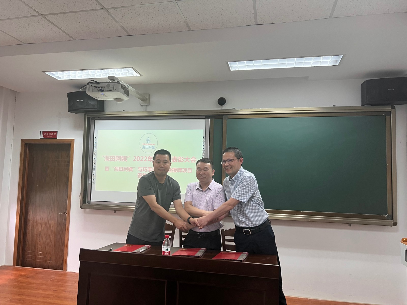 在所有参会“海田阿姨”的见证下,澥浦镇政府、巧手家政、澥浦成校三方代表上台完成联合授牌项目的签约,“海田阿姨”品牌与家政企业首次携手共进,协同发展。